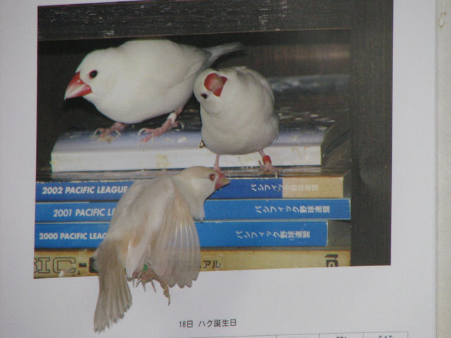 チャピ君、我が家の文鳥カレンダーに写ったハツちゃんにご執心の様子。
