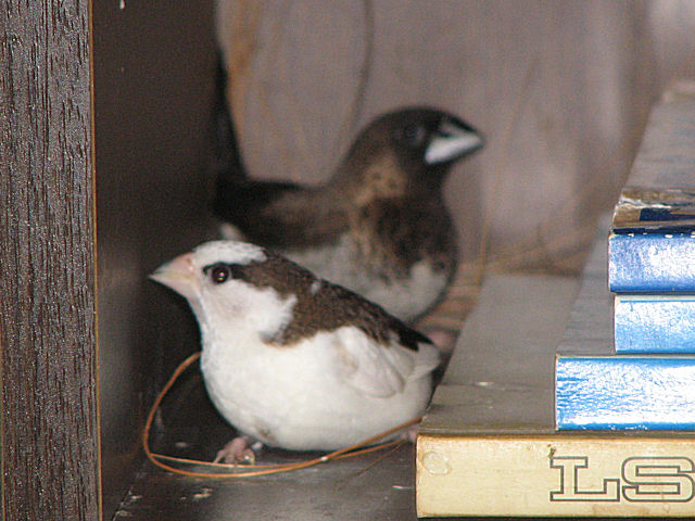 でも、放鳥中は、イチと協同で本棚に巣材を運び込み、こちらを本宅にしようと目論んでいるようです。