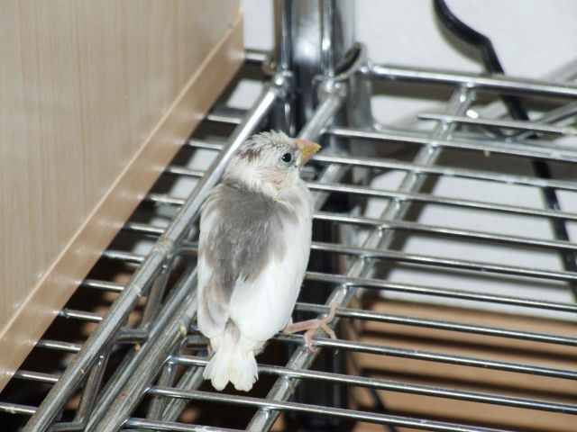 にも関わらず、二回目の挿し餌のとき、いきなりふごから飛び出て初飛行!驚きました。ペットショップでは桝カゴで飼育されていたので、突然広い場所に出られて嬉しかったのかも知れません。