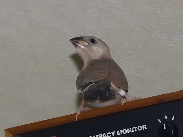 2010-11-29 18:01:00 [01399] 飛べたじょ カテゴリ:[ アツ ] 一丸、飛べました。天井のスピーカーまで一っ飛び。いつもの事ですが、初めて高いところまで飛んだヒナちゃんは、どことなく誇らしげです。 comments(2) COMMENTS 2010-11-29 21:56:41 Re:飛べたじょ (いずみん) もう飛べましたか!これが普通なんでしょうか。すごく早いような気がしますが。やはり大勢の中で育つとみんなのように飛びたい という欲求が早くからでるのかしらん(^^) 2010-11-29 23:27:29 Re:飛べたじょ (bko) >いずみんさん厳密な初飛行(ふごから飼い主まで飛ぶ)は、標準的だったのですが、そこから長距離飛行する勇気がなかったらしく、数日足踏み。長距離飛行の日数は、少し遅めでした。ちなみに、我が家のヒナたちの初飛行は、平均して孵化後27日、長距離飛行は羽化後30日ですが、一丸は27日/33日でした。 編集パスワード: Post A Comment お名前(*) メールアドレス (非公開) タイトル(*) コメント(*) 編集パスワード(*) (*)の項目は必須項目です お名前とメールアドレスをクライアントに記憶する コメントを投稿する場合は、Javascriptを有効にする必要があります。このメッセージが見えている場合は、Javascriptは無効になっています。コメント投稿ができません。