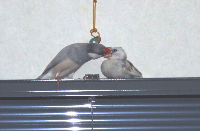 普段から私の毛づくろいまでしてくれるお世話焼き文鳥のループちゃん、ハツの育ての親を買って出てくれた様です…
