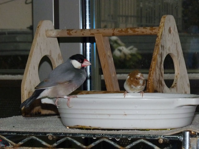 文鳥たちが水浴び場にやってくると、となりにチョコっと止まって、水浴びの催促です。