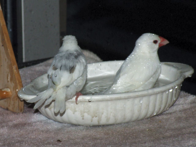 以来、まともな水浴びをしなくなってしまいました。ハツの水浴びは、ご覧のように他の文ちゃんが水浴び中に側に来て、しぶきを浴びながら顔だけ水に入れてブルブルします。