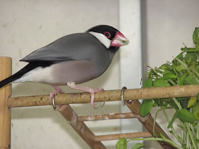 くちばしに青菜をつけながら豆苗を食べるキタ