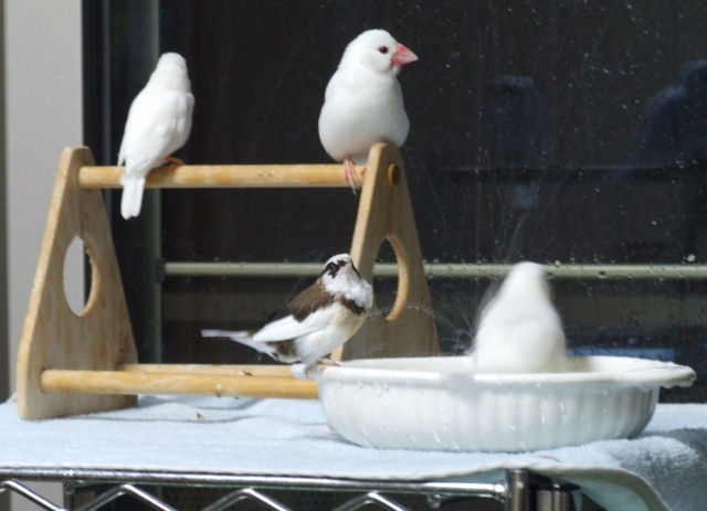 例えば、文鳥たちが水浴びをしている時に、コノ位置に居ると、自分でバタバタしなくても水浴びが出来るんだ。便利だろ?