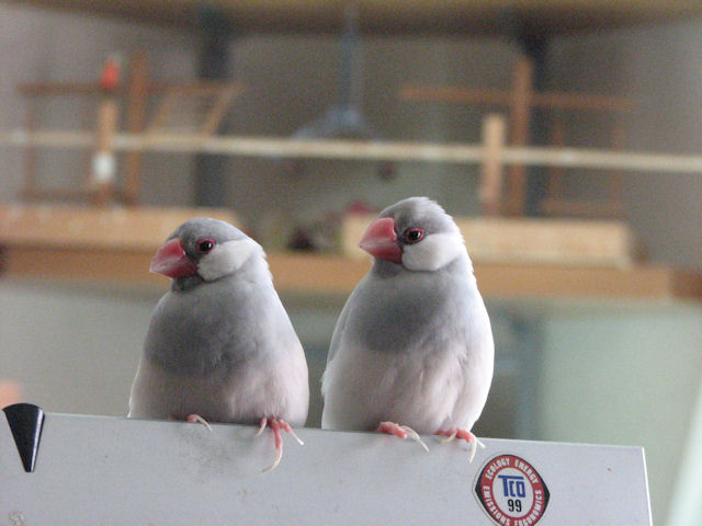 2009-02-10 18:24:00 [00935] シルバーペア(2) カテゴリ:[ 旧blog記事 ] ルート&ループのキュートピクチャその2右から撮影。二羽とも揃って右向け右。カメラ目線でポーズしてくれました。 comments(2) COMMENTS 2009-02-11 20:04:00 Re:シルバーペア(2) (みす) こんにちは!お久しぶりです(*^_^*)ぬいぐるみのようにキュートですね!!ゴウくんもパソコンの上が好きで「ダメだよ」と下ろしてもすぐ飛んでいって乗ってしまいます・・・すっかり私のアイドルとなっています(*^_^*)お借りしているマスカゴ、外出時に送りますので、もう少々お待ちください。すみません 2009-02-11 23:10:00 Re:シルバーペア(2) (bko) パソコンの上ですね・・・私が、始終パソコンの前に座っている(放鳥部屋では、そこにしか椅子がないので…)せいで、飼い主と遊びたいときは、「パソコンのモニタの上にとまって、じっと飼い主を見る」ってのが、我が家の文鳥たちの習慣ですからね。三つ子の魂百までと申しますか、その習慣は、なかなか抜けないかも知れません… 編集パスワード: Post A Comment お名前(*) メールアドレス (非公開) タイトル(*) コメント(*) 編集パスワード(*) (*)の項目は必須項目です お名前とメールアドレスをクライアントに記憶する コメントを投稿する場合は、Javascriptを有効にする必要があります。このメッセージが見えている場合は、Javascriptは無効になっています。コメント投稿ができません。