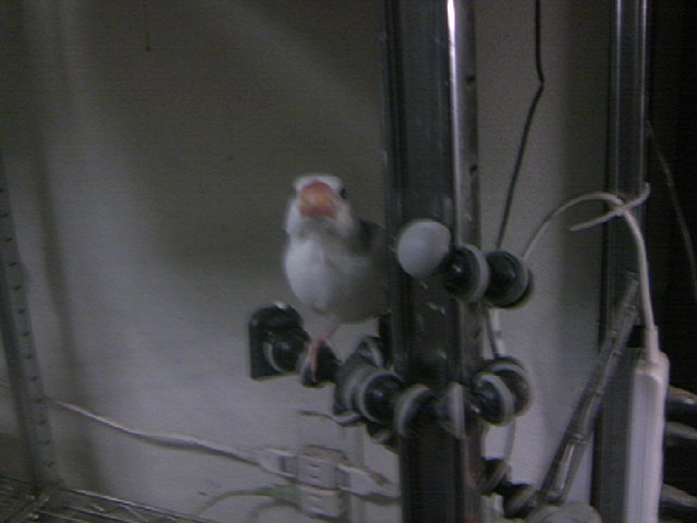 昨日は、オトナ文鳥たちのケージを表敬訪問。さっそく、チャピに歓迎の一撃を食らったようです。
