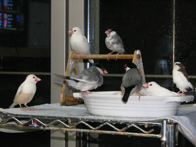 だいたい三羽くらいが同時に水浴び。あと三羽が順番待ち。ついでに一羽が水しぶき浴び、などという光景がよく見られます。